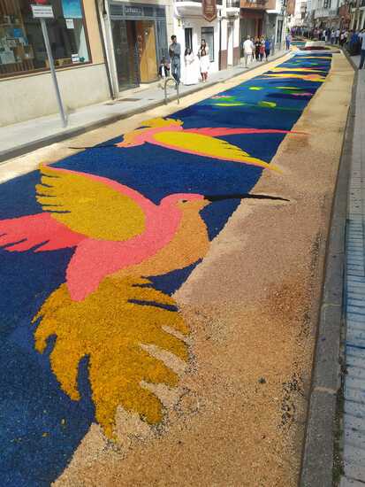 Los distintos trabajos se reparten entre todos los vecinos, pues a la hora de la procesión tienen que estar todas las alfombras perfectas para el gran acontecimiento, y ellos han de haber terminado a tiempo, para poder acudir bien engalanados para la ocasión.